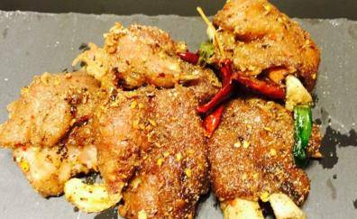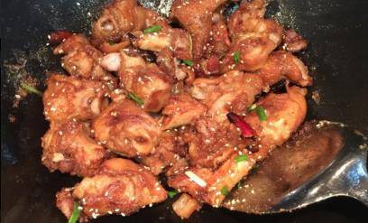 鍋中留底油,下辣椒段和蒜末煸香,倒入炸好的豬蹄,撒入椒鹽孜然和蔥,炒勻出鍋(撒上一些芝麻會很香,喜歡吃辣的可以把辣椒段改成辣椒碎)。