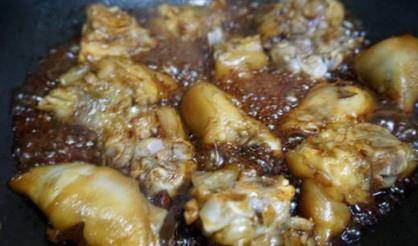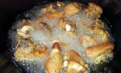 鍋中倒油,燒至九成熱時倒入豬蹄,炸到表皮酥脆撈出(實在扛不住,就戴個手套吧,這種天氣穿的比較厚,夏天就要在手臂上戴上袖套,油飛濺在手上真的很疼,還可以在鹵好的豬蹄瀝幹後撒上撒一點淀粉,會減少油飛濺,炸好後也會更加酥脆一些)。