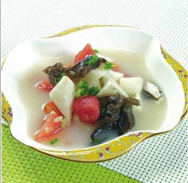 材料/白蘿卜塊200克,西紅柿1個,黑木耳50克,蔥末適量,水發香菇塊少許。
