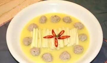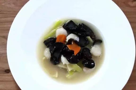 最後,這個雞湯、蒲菜段、木耳、胡蘿卜、冬筍、蝦仁等食材,再用中火來煮沸,再依次加入鹽3g,胡椒粉1g來調味,並水淀粉5g,香油2g,燒好後就可以盛出擺盤瞭,即可食用。