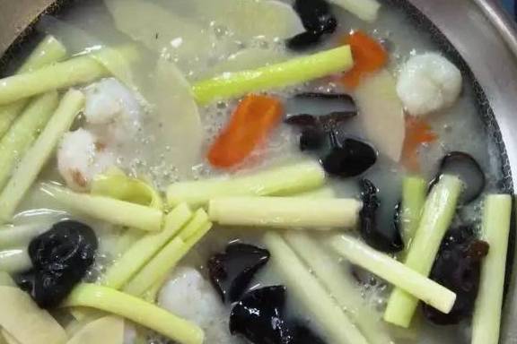 到這裡,還需要依次加入切好的木耳、胡蘿卜、冬筍進去,還有蝦仁也要放入,然後再用大火繼續煮沸。