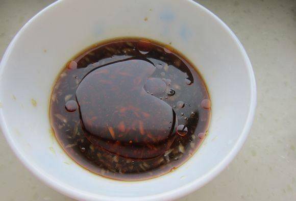 9、將大蒜用絞蒜器搗碎,放入碗中,加入花椒粉、花椒粉、醋、醬油、白糖拌勻,淋在切好的皮凍上,淋上辣椒油。這。