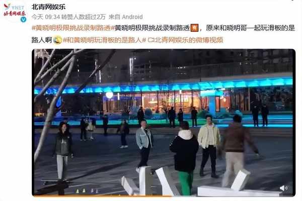 3月28日晚,據北青網消息,原來這是黃曉明錄制《極限挑戰》的路透,和他一起玩滑板的是路人。畫面中,嶽雲鵬也在錄制現場。