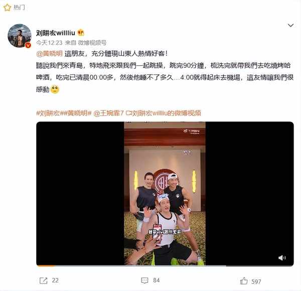 5月19日,劉畊宏也發微博回應黃曉明:“這朋友,充分體現山東人熱情好客!”
