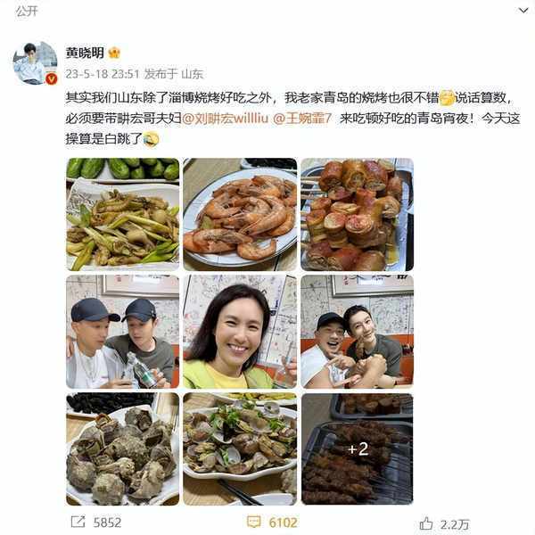 黃曉明曬出多張圖片寫道:“其實我們山東除瞭淄博燒烤好吃之外,我老傢青島的燒烤也很不錯!說話算數,必須要帶畊宏哥夫婦來吃頓好吃的青島宵夜!今天這操算是白跳瞭。”