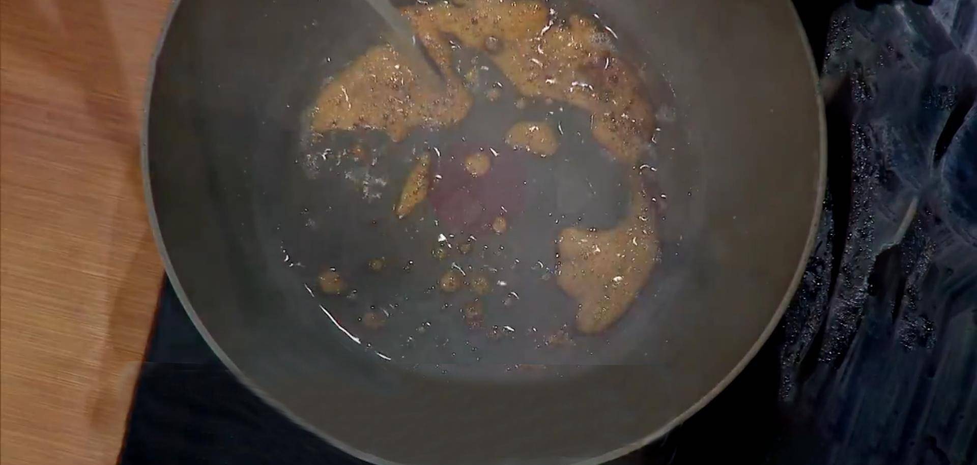 鍋中倒入底油,放入白糖,白糖稀化以後,起泡時倒入開水定型,此時顏色為最佳。