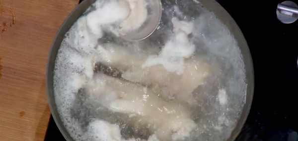 然後鍋中放入涼水,放入豬蹄,焯水。註意,豬蹄一定要冷水下鍋,水開以後放入豬蹄的話,豬蹄被開水一激,肉質容易發老。水開以後撇去浮沫,撈出備用。