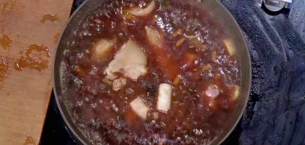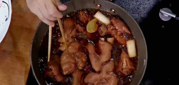 將焯好的豬蹄剁成塊,然後放入醬湯中,大火開鍋,然後轉小火燉兩個小時。
