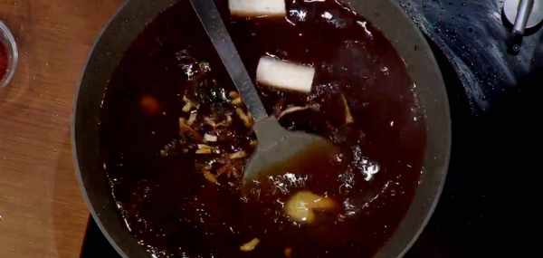 炒好糖色的鍋中加入開水,量以能末過豬蹄為宜。然後開始調制醬湯,放入黃醬,提香。適量紅曲粉,倒入醬油、料酒、蔥、薑、花椒、大料、丁香、豆蔻、桂皮,顏色調完後為棗紅色,如果顏色淺的話,再以適量老抽調色;顏色不夠漂亮的話,再加一點紅曲粉。