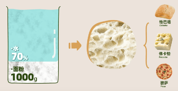 當含水量上升到70%以上時,由於面筋結構疏松軟蹋,烘烤時產生大量水蒸汽,導致面包內部形成許多大氣泡,意式面包恰巴塔(Ciabatta)、佛卡恰(Focaccia)和披薩(Pizza)面團含水量都很高。