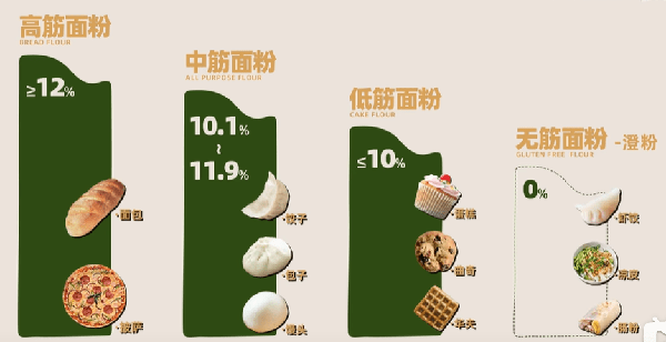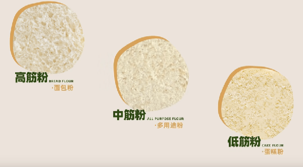 第一步是選對面粉,按照筋力,面粉可分為高筋、中筋、低筋、無筋。在中國標準中,高筋面粉蛋白質含量≥12%,適合制作面包,低筋面粉蛋白質含量≤10%,適用於餅幹、蛋糕,介於這兩者間的是中筋面粉,一般用來做饅頭、餃子等面食。還有不含蛋白質的無筋面粉,也叫澄粉,可以用來做涼皮、腸粉。