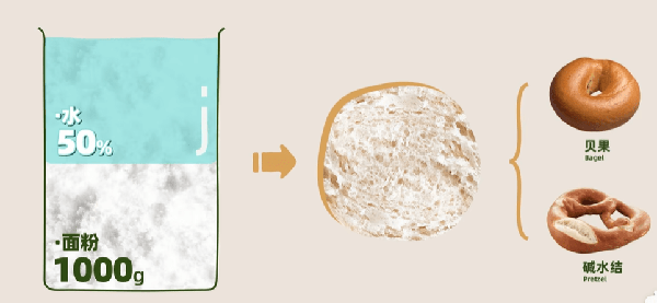 以高筋面粉為例,當1000毫升面粉中加入500毫升水,即含水量50%。這時,面團的質地幹燥緊實,氣孔較少,適合制作貝果(Bagel)、德國堿水結(Pretzel)等耐嚼的面包。
