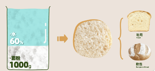 含水量為60%左右時,面團柔軟,彈性較強,最常見的吐司(Toast)和歐包(European Bread),含水量都在這個區間。