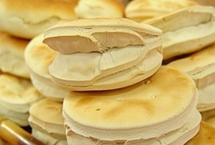山東濰縣一帶鄉村流行制作一種火食,這種火食和面時加水甚少,用手揉不成團,隻好在面板上用木杠壓制,當地人送其雅號“杠子頭火食”。但後來漁民們發現,火食經海風一吹,變得又幹又硬,難以下咽,於是在制作時加上油和糖,成為今天的糖酥杠子頭火食,現已成為煙臺的一種特色小吃。