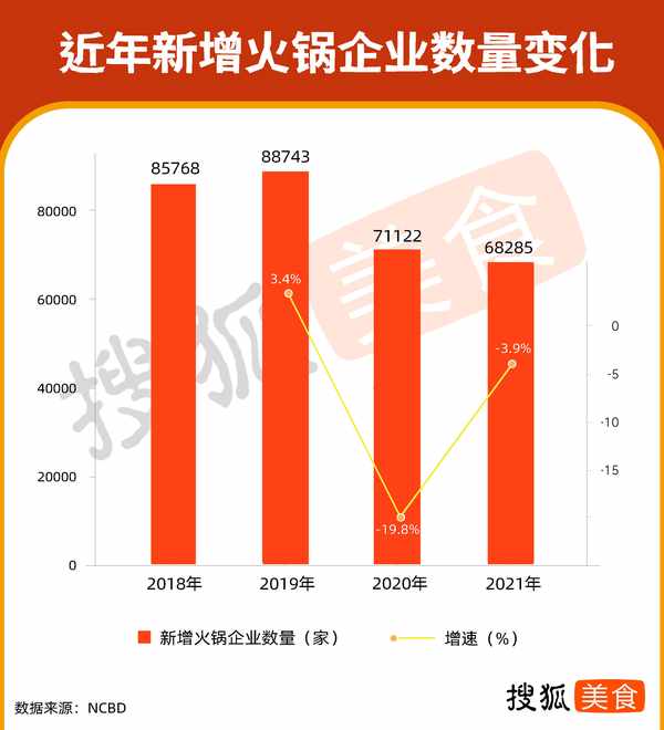 搜狐美食統計瞭2018-2021年火鍋企業新增情況。近年來,火鍋企業仍保持逐年大規模增長。2019年,新成立的火鍋企業近9萬傢。2020年受新冠疫情影響,增速大幅下降,但2021年增速有較大回彈。火鍋仍舊是被看好的賽道。