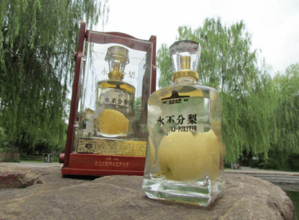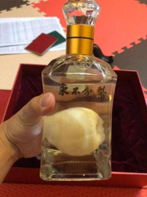 這個酒水裡面的梨也是這樣的,挑選梨的時候要挑果子成熟後比酒瓶寬度和長度小的,那樣的話才不會變形,保持它原本的形狀。在梨小的時候就測量好距離,將它放進酒瓶中,長大之後再把上面的莖剪掉,它就落在瞭瓶子裡,之後再做成酒水。這款酒水的酒精度數不高,可能不太適合口味重的酒友,還是要理性購買。