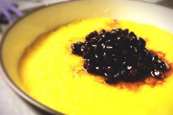 5.待蛋黃液呈糊狀時,隨即一邊往鍋內慢慢加入熟豬油,一邊用炒勺不停地按照一個方向攪拌,等到蛋黃糊變得柔軟有勁,色澤黃亮,不粘炒鍋時便做好瞭。