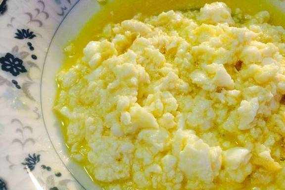 4.將炒鍋置於中火上,放入熟豬油燒熱,將調好的蛋黃液過篩倒入油鍋內,迅速攪動。