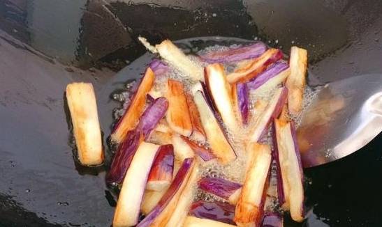 第三步:在鍋中放熱油,等油溫上瞭之後放入茄子,用中火把茄子炸熟,兩面看著焦焦的就行瞭,然後撈出控油。