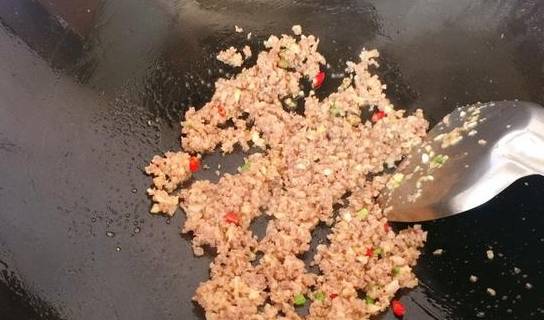 第五步:加入肉末爆炒,炒至變色就行。加入炸好的茄子,準備少許淀粉加水拌勻,加入鍋中,大火收汁就可以瞭。