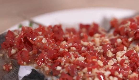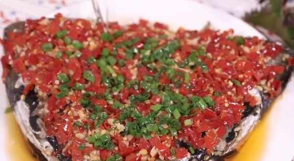 5、把蒸好的魚頭拿出來淋上剁辣椒再放入鍋中蒸個10分鐘就可以出鍋開吃啦!鮮艷的顏色,引人入勝的香味,真是讓人流連忘返。