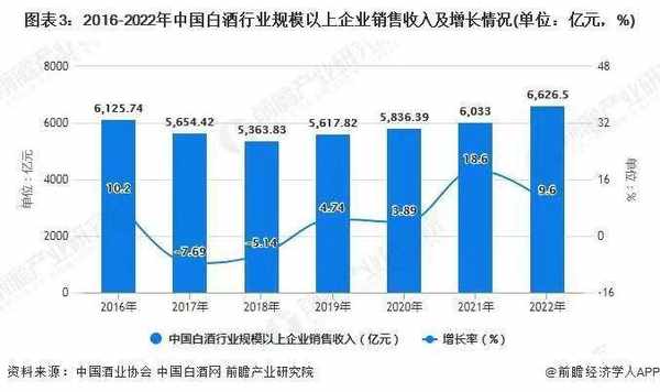 研究數據顯示,2022年中國白酒行業規模以上企業累計完成產品銷售收入達到6626.5億元,累計增長9.6%。累計實現利潤總額2201.7億元,累計增長29.4%。