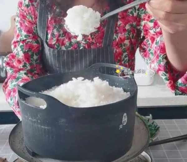 這時米飯也做好了,拿勺舀了看看就可以看出米飯Q彈,顆粒分明。