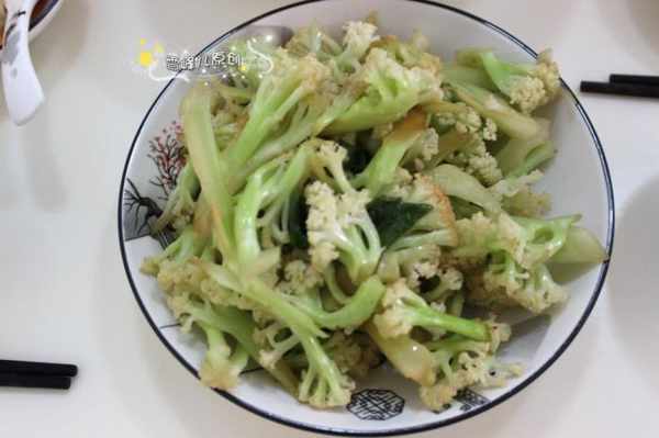 幹煸菜花,這道菜很簡單也很快捷,只要花菜用刀劈開,鍋裏放入葱米爆香,倒入菜花幹煸炒熟,加鹽調味就成了。