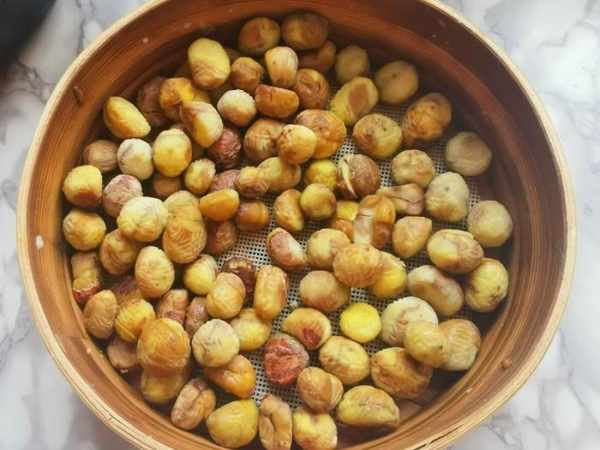 這就是去皮蒸好的栗子,去皮後回家清洗一下,放到籠屜中,大火蒸20分鐘就可以熟透。栗子的營養價值很高,素有"乾果之王"的美譽,鮮板栗所含的維他命C比公認含維他命C豐富的蕃茄還要多,更是蘋果的十多倍,我們秋季一定不要錯過栗子的味道。