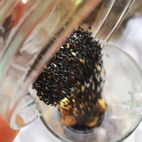 加入半小碗的黑芝麻,黑芝麻的量可以隨意就好,黑芝麻我用的熟黑芝麻。