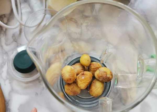 把破壁機清洗乾淨,擰緊杯體,先把蒸熟的栗子放入到破壁機中。