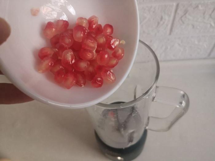 破壁機清洗乾淨,倒入石榴籽。石榴籽打碎以後裡面的石榴籽更有益處。