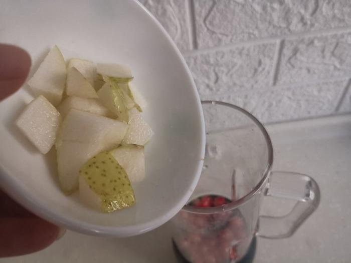 說到這裡我們大家也知道了這兩種水果搭配的好處,那麼我們就一起來做一杯排毒養顏汁吧。先把石榴去皮留籽,梨子洗淨帶皮切成小丁。