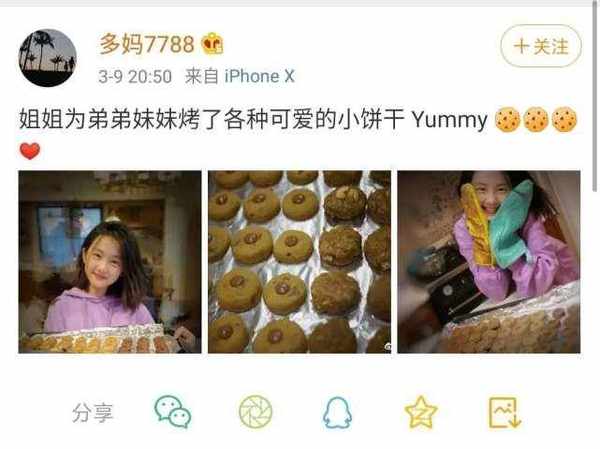 多多從參加節目開始就給人一種很溫暖的感覺,如今的多多也是更加的有大傢閨秀的樣子,可以說是琴棋書畫樣樣精通。再加上如今因為疫情不能出門的原因,多媽也不止一次曬出多多在傢做好吃的給傢人的照片。在11月9日,多媽就在自己的個人社交賬號上曬出瞭多多烤餅幹的照片,成品看上去就十分的有食欲。