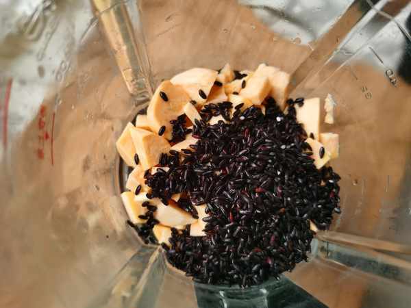 我們把紅薯去皮切成小丁,核桃仁2塊,黑米洗淨,一起放入到破壁機中。多放一些紅薯主要是為了新增味道以及口感。