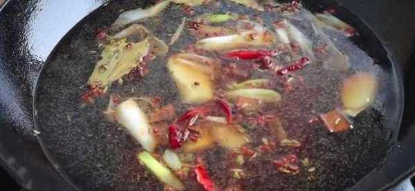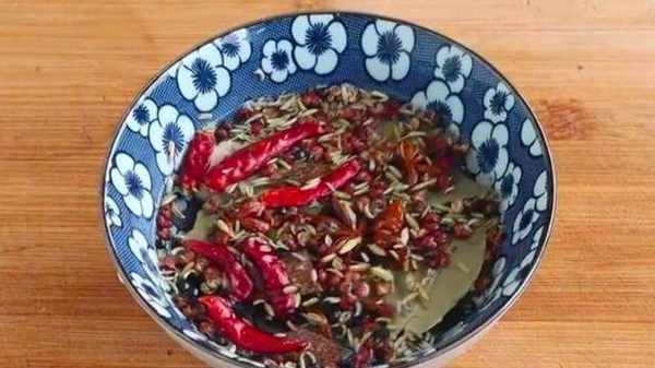 2、準備需要配料,碗裡放入香葉、白芷、八角、桂皮,小茴香,花椒,一個去籽草果,幾個幹辣椒,然後加入水進去泡幾分鐘,泡好後再控幹水分備用。再切點蔥段和生薑片。