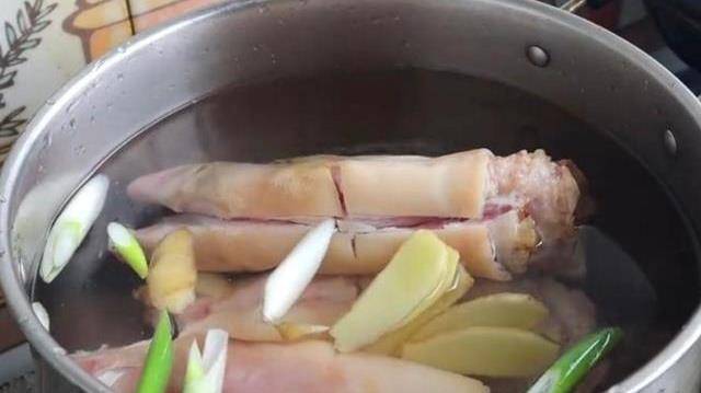 1、豬蹄全部處理幹凈,直接冷水下鍋,加入蔥段和生薑片,少量的高度白酒去腥味,開大火煮開,不用蓋鍋蓋,讓鍋裡的異味都能夠散發出來,大火煮開後,再煮十分鐘左右關火。