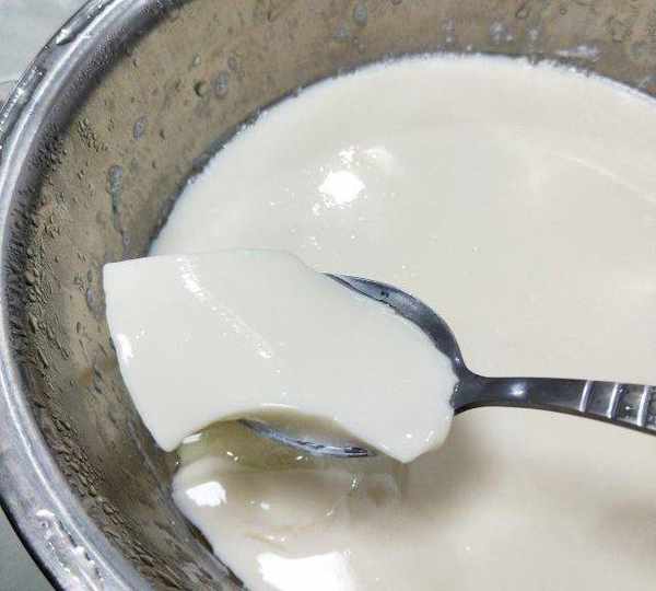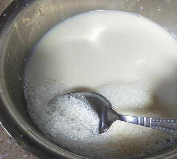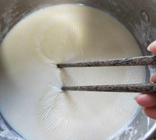 第12步、豆漿從高處沖入盆中,無需攪拌。