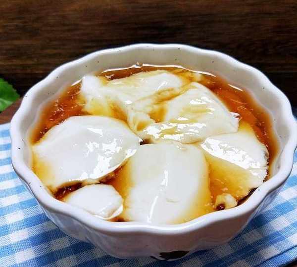 第16步、20分鐘到,豆花做好瞭,光滑細膩,拌上紅糖水,開吃。