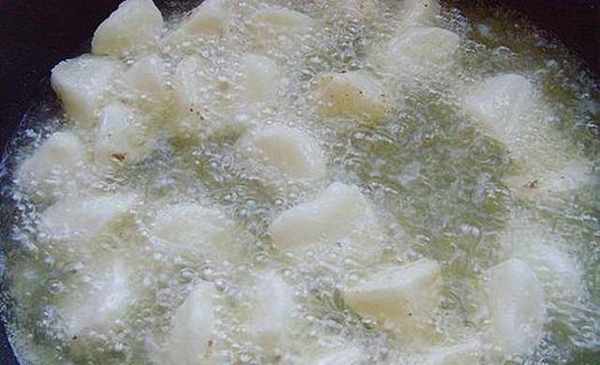 第三步:開鍋,鍋內加入適量食用油,油溫50-60%熱時撈出泡好的山藥,瀝幹水分,放入油鍋中小火慢炒。中火加熱,直到山藥表面變成金黃色。