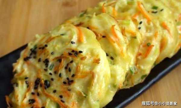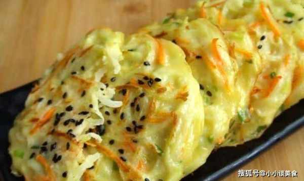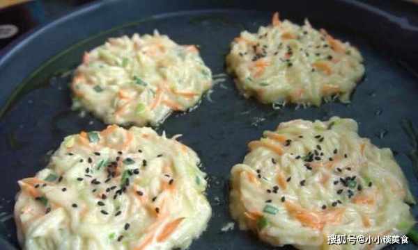 4.預熱電烤盤並刷凈油,放入蔬菜糊,用小塊整理形狀,稍微圓一點。在薄餅上撒些黑芝麻,打開派鍵烤3分鐘左右,翻蓋再烤3分鐘,至兩面金黃即可出鍋。整個過程用瞭6分鐘,簡單又好吃的臘南瓜菜餅就做好瞭。尖端: