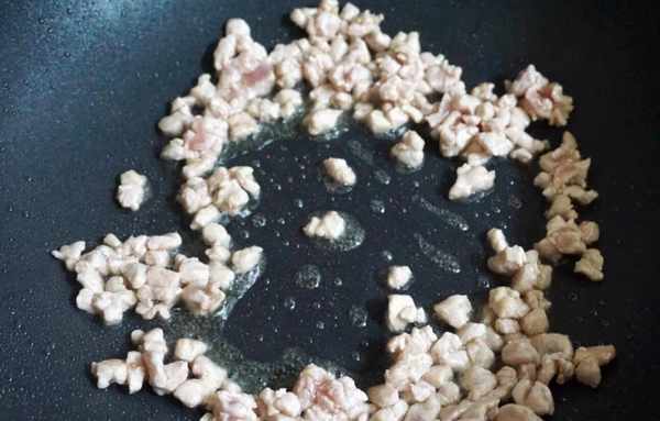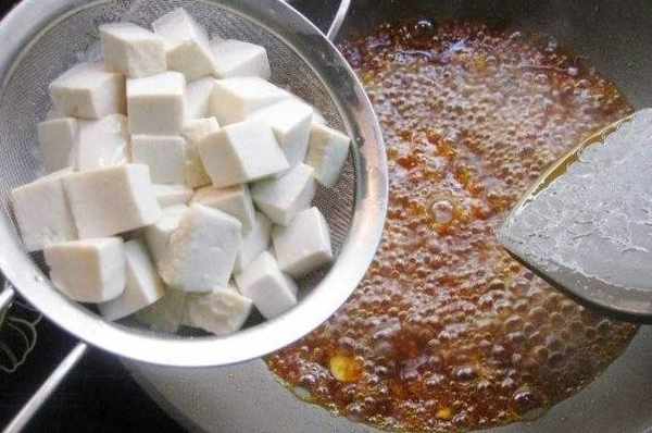 和紅燒豆腐不同的是,麻婆豆腐並不使用油煎炸,而是先在鍋中備下沸水,加入少量的食鹽,然後將切成兩厘米見方小塊的豆腐塊放入其中小焯一下,去除豆腥味,然後撈出來用清水浸泡一番,瀝幹水分備用。