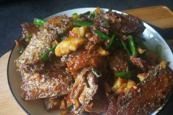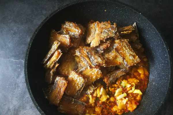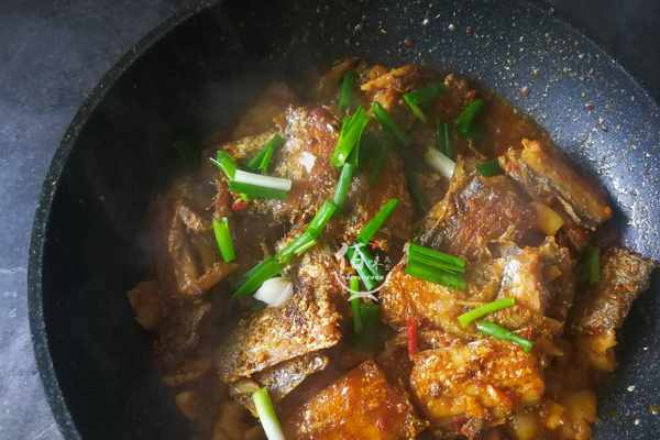 6、接著倒入清水,再大火烹飪三分鐘,期間可以撒入少量的香蔥;讓香味通過水分和溫度滲透到帶魚的肉類,這樣吃起來口感更香濃,味更足;再大火收汁,燒去鍋內多餘水分,待湯汁稍見濃稠時,即可撈出;