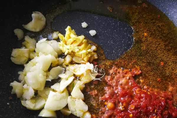 4、另起鍋,倒入適量食用油,倒入豆瓣醬