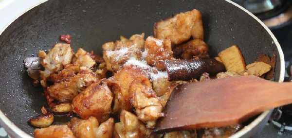 5、炒成這個模樣,鍋中繼續放入適量的白砂糖,再加入適量的鹽後繼續攪拌均勻。