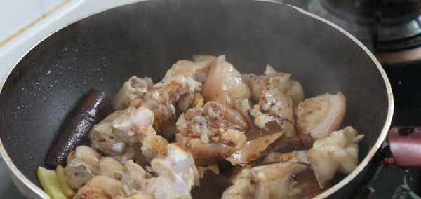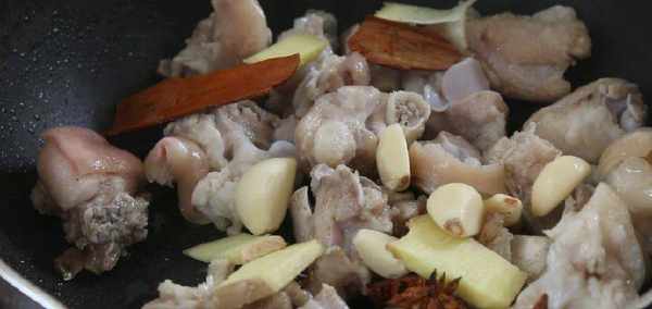 3、洗幹凈鍋後加熱鍋,鍋中放入適量的油,待油溫8分熱後倒入洗幹凈的豬腳攪拌幾下,加入洗凈的桂皮,八角,大蒜頭和生薑片、香葉在鍋中一起翻炒均勻。