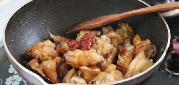 4、鍋中加入適量的醬油,生抽,味極鮮(如果隻有醬油的也可以就放醬油)加上適量的豆瓣醬增色調香,用鍋鏟將豬腳在鍋中攪拌均勻,直到每塊豬腳上都顏色均勻。