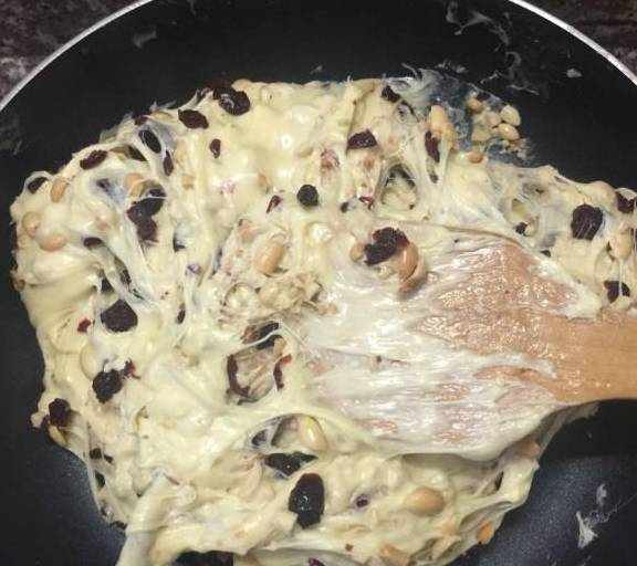 第10步、奶粉完全融合棉花糖後關火,倒入花生碎和蔓越莓幹