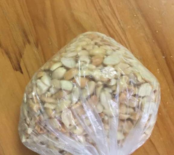 第5步、直接買回來的原味炒花生,剝好後用搟面杖壓碎