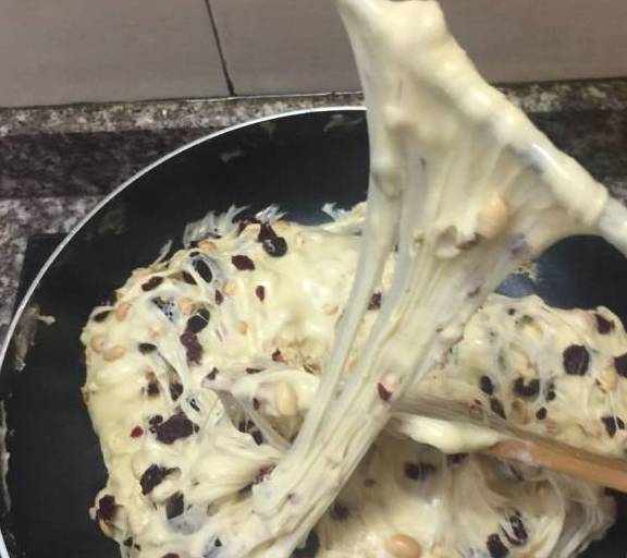 原料:棉花糖、奶粉、黃油、蔓越莓幹、花生碎。